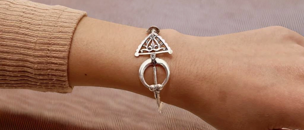 Le bijou est Ă©galement ornĂ© d’une fibule en argent massif, un objet dĂ©coratif et symbolique issu du patrimoine berbĂšre. En tamazight, elle est appelĂ©e tiseghnest (pl. tiseghnas), ou encore tazerzit (pl. tizerzay) selon les rĂ©gions.