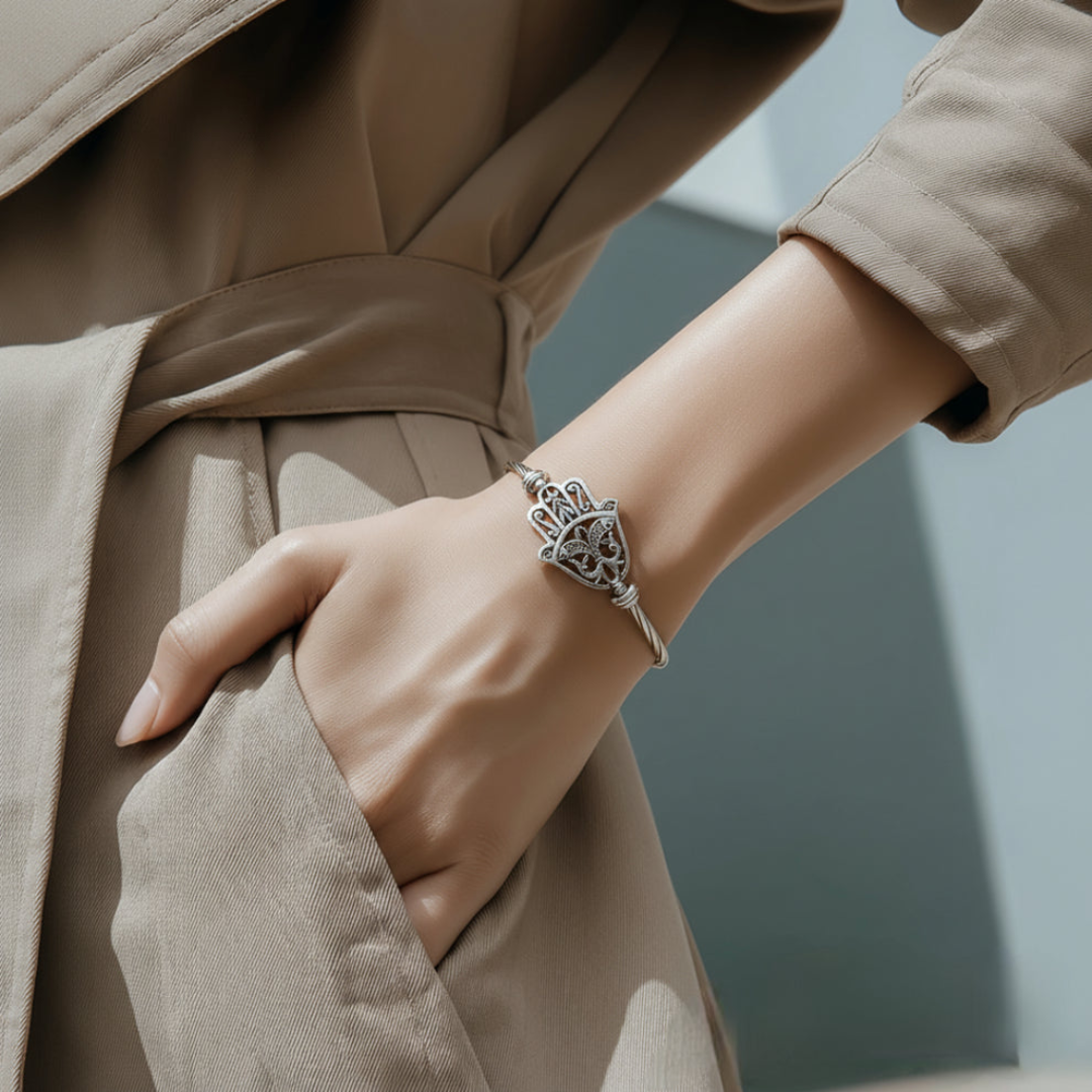 Découvrez le mariage du savoir-faire traditionnel avec l’Histoire des Berbères et des dynasties musulmanes de l’Afrique Septentrionale, symbolisé par la #khomsa en argent massif, un motif hérité du patrimoine berbère, Amazigh, kabyle. Ce symbole, en plus d’être artistique, porte une signification profonde, étant ancré dans la culture et l’histoire d’un peuple.