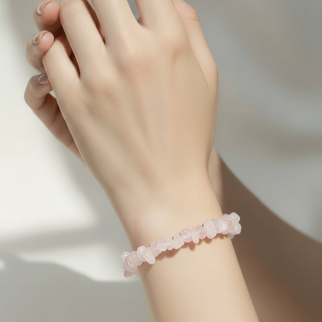 bracelet en pierre quartz rose, bracelet quartz rose en chips, bijou en quartz rose, bracelet énergétique, bracelet en pierres naturelles, bracelet bien-être, cadeau en quartz rose, bijou apaisant, accessoire élégant.